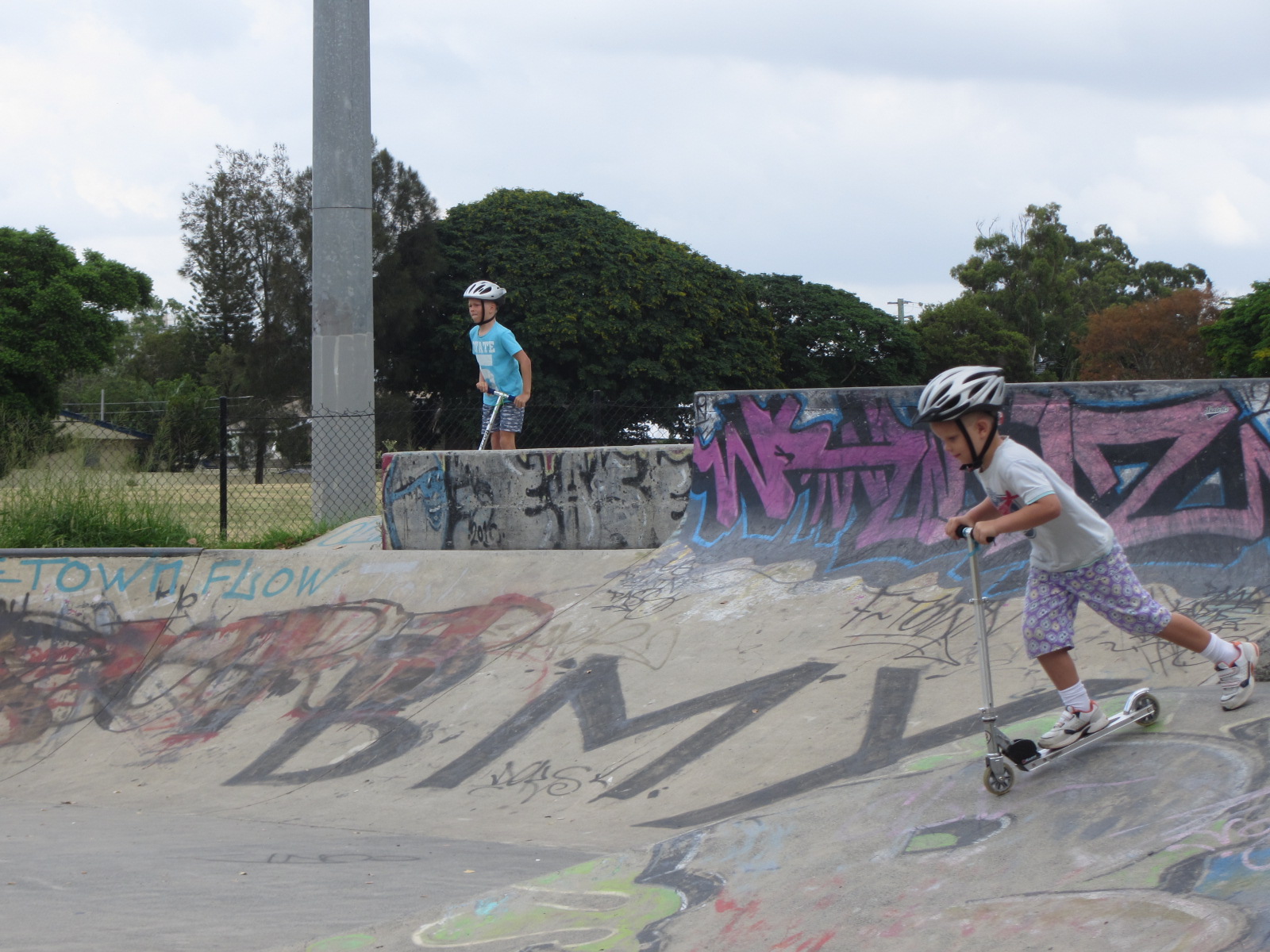 Riding of scooters, early before the teenages got up and it got busy. Its amazing how well superheros and ninjas ride scooters and save the day.